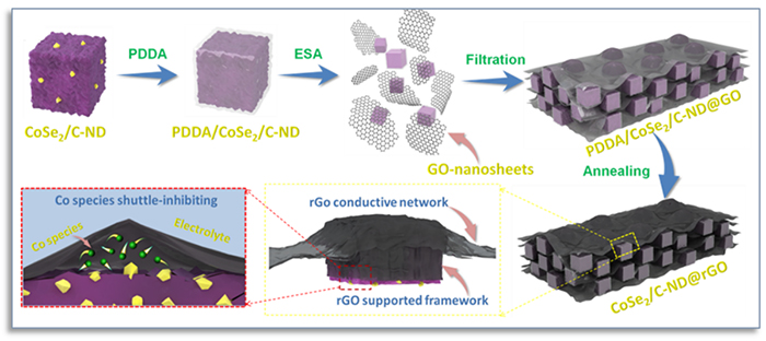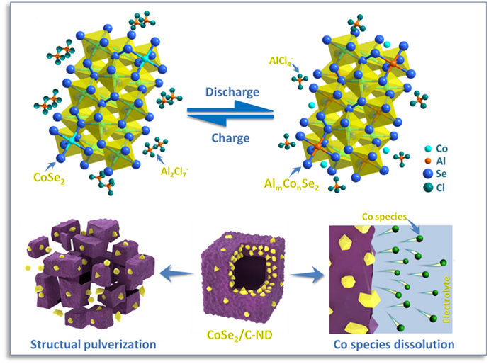 在这项工作中,蔡同辉首先制备了一种金属硫族化合物复合材料(CoSe2/Carbon Nanodice),并进行了详细的电化学测试和结构表征,以揭示其储能机理。研究结果表明,在放电过程中Al3+可嵌入到CoSe2晶体,生成单质Co和AlmConSe2(即Al3+取代CoSe2中的部分Co2+)。同时还发现,该电极材料的容量衰减可归因于充放电过程中活性钴物种的溶解流失,以及CoSe2复合材料的粉化。在此容量衰减机制的指导下,作者采用静电自组装法将rGO紧密包覆CoSe2/Carbon Nanodice,得到新型CoSe2/Carbon Nanodice@rGO复合材料。研究结果表明,rGO包覆实现了抑制Co溶解、缓解CoSe2/Carbon Nanodice材料粉化以及增加导电性的三重目的,从而显著提高了电极材料的循环性能。该新型复合材料经过500次循环测试后放电容量仍然可达143 mAh g-1,比此前报道的金属硫族化合物材料的循环性能有显著提高。兼顾放电容量和循环寿命这两项技术指标,CoSe2/Carbon Nanodice@rGO复合材料的储电性能优于此前报道的所有正极材料。