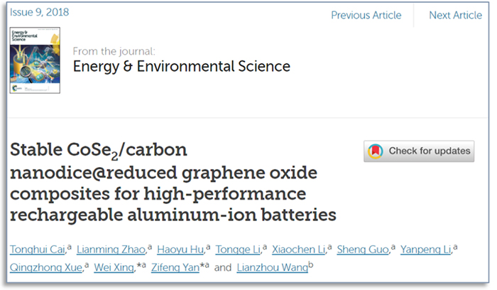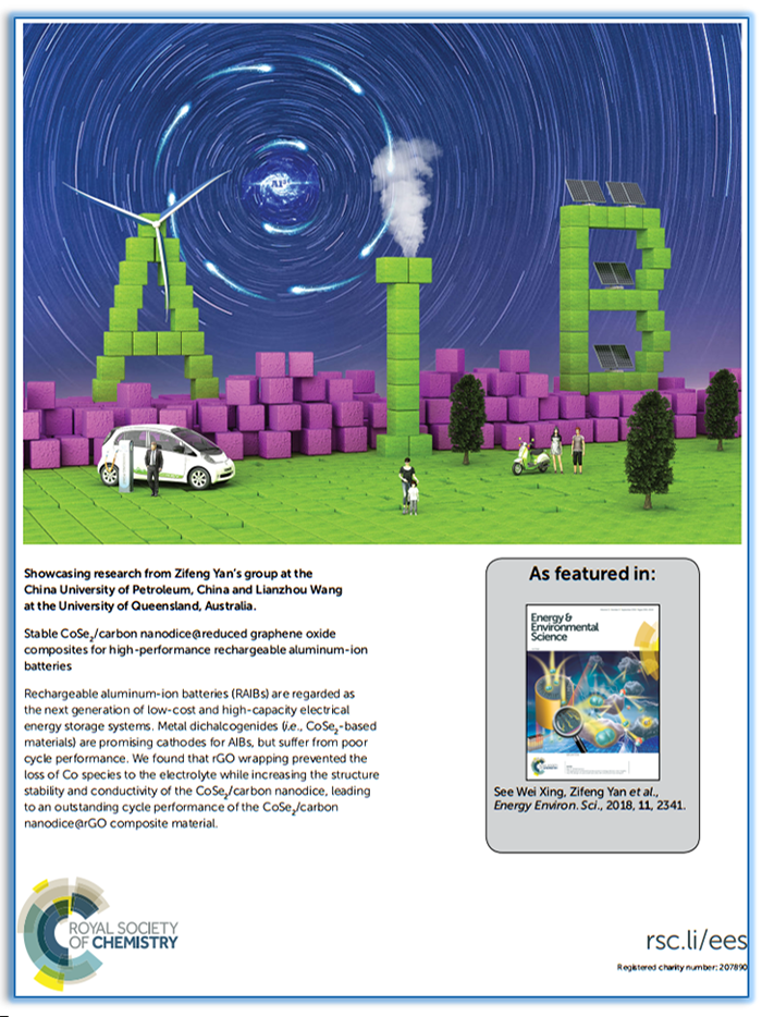 【本站讯】近日,yl23455永利重质油国家重点实验室阎子峰教授和邢伟教授团队与昆士兰大学纳米材料研究中心王连洲教授合作,在新型铝离子电池(AIB)研究中取得重要进展,科研论文“用于高性能铝离子电池的二硒化钴/碳纳米骰子@还原石墨烯(CoSe2/Carbon Nanodice @rGO)复合材料”(Stable CoSe2/Carbon Nanodice@Reduced Graphene Oxide Composites for High-performance Rechargeable Aluminum-ion Batteries),以封底文章(Back Cover)的形式在国际能源与环境科学领域顶级期刊Energy & Environmental Science在线发表,论文第一作者为yl23455永利2015级博士研究生蔡同辉,阎子峰教授和邢伟教授为共同通讯作者,中国石油大学(华东)为研究成果第一署名单位和唯一通讯单位。