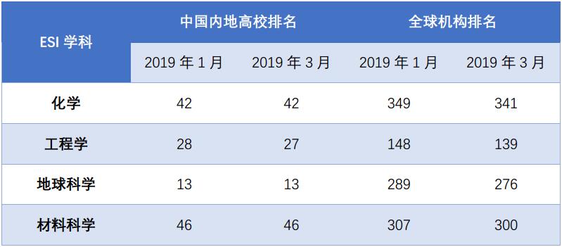 2019年3月14日,ESI数据库发布最新数据显示,中国石油大学化学、工程学、地球科学、材料科学学科等4个ESI前1%学科在中国内地高校中,分别排42、27、13和46位,其中工程学学科相比2019年1月排名上升1位。