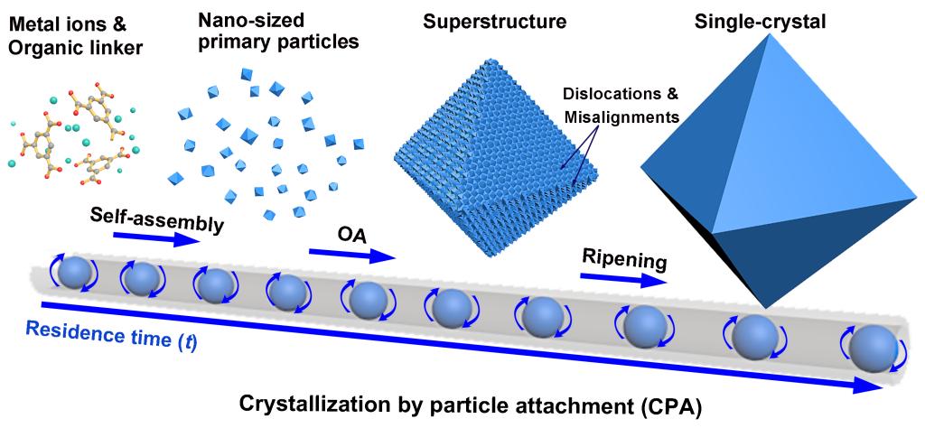 鉴于金属有机框架材料晶体生长机理的重要性,赵学波教授带领博士研究生王颖,副教授李良军、代鹏程等人利用团队研发的微液滴连续反应装置,以经典的金属有机框架材料HKUST-1、MOF-5和NOTT-100为研究对象,通过调整反应时间和快速终止反应,成功捕捉金属有机框架材料晶体生长初期的一系列“中间态”,考察了其在各个生长阶段的结构特征,阐释了其生长机理。经典的结晶理论认为,结晶经过两个阶段,首先是晶种的生成,然后小晶体逐渐长大。晶体在成长过程中,不论尺寸大小,内部结构都是相同的。但本项研究发现,金属有机框架材料晶体生长过程经历了三个状态:初始金属有机框架材料纳米晶体颗粒、金属有机框架材料超结构和金属有机框架材料单晶。在结晶过程初期,配体和金属离子进行自组装配位反应,形成纳米级的金属有机框架材料小晶体颗粒;随后,小晶体通过有序组装,形成具有规则形貌的金属有机框架材料超结构;随着反应时间的延长,超结构在Ostwald熟化作用下逐渐修补完善,生长成为完美的金属有机框架材料单晶。这个过程好比建房子要先搭框架,再添砖瓦。正像不同房子有不同的框架结构一样,不同金属有机框架材料也有各自的特殊超结构,并且这种超结构具有不同与其本征金属有机框架材料的特殊性质。本项研究结果证实,HKUST-1超结构具有更高的甲烷和二氧化碳吸附能力。超结构是非经典的结晶模型“定向附着晶化”过程(Crystallization by Particle Attachment, CPA)的一个重要中间态,桥连着无序的反应物单体与高度有序的单晶结构两种结晶状态,也是CPA机理的代表性标志。本项研究成果不仅对理解金属有机框架材料的晶体生长过程具有重要意义,还将有助于特殊结构和形貌金属有机框架材料的合成,以及金属有机框架材料应用器件的构建。