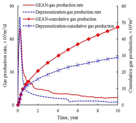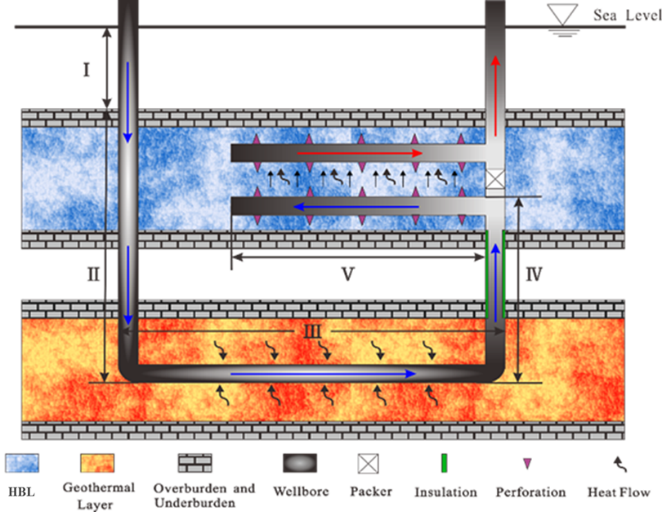 传统的降压、注热等水合物开采方法存在分解速度慢、加热设备投入大、热损失高、经济性差等缺点,严重限制了水合物的高效开发。该研究首次提出了一种利用水平换热井注海水携带地热能辅助降压法开采天然气水合物藏的新方法,并在耦合数值模拟模型的基础上验证了其有效性。该方法主要通过一口延伸至地热层的水平换热井对注入的海水进行热交换,并将加热后的海水上返至水合物藏,增加水合物分解效率,从而实现高效开采天然气水合物藏的目的。由于采用井筒换热的方式,无需对地热层进行水力压裂作业,在节约施工成本的同时,降低了对地热层的损害。此外,与常规热激发法相比,该方法无需采用化石燃料对海水进行加热,具有低碳环保、能量利用率高等特点,相关研究成果为天然气水合物藏的高效开采提供了技术手段和理论依据。