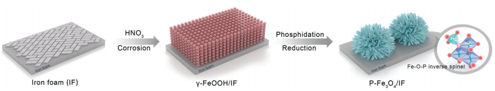 图3磷化构筑反尖晶石结构P-Fe3O4/IF高效析氢机制图