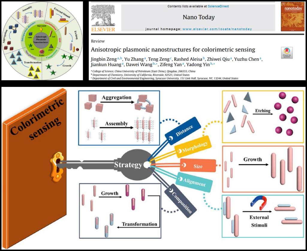 题目为《用于比色传感的各向异性等离子体纳米结构》(Anisotropic plasmonic nanostructures for colorimetric sensing)的综述论文发表在材料领域权威期刊Nano Today (DOI information:10.1016/j.nantod.2020.100855)。曾景斌副教授为该论文第一作者,加州大学河滨分校殷亚东教授、王大伟研究员为共同通讯作者。中国石油大学(华东)为第一署名单位。该项工作得到国家自然科学基金和中央高校基本科研业务费资助。