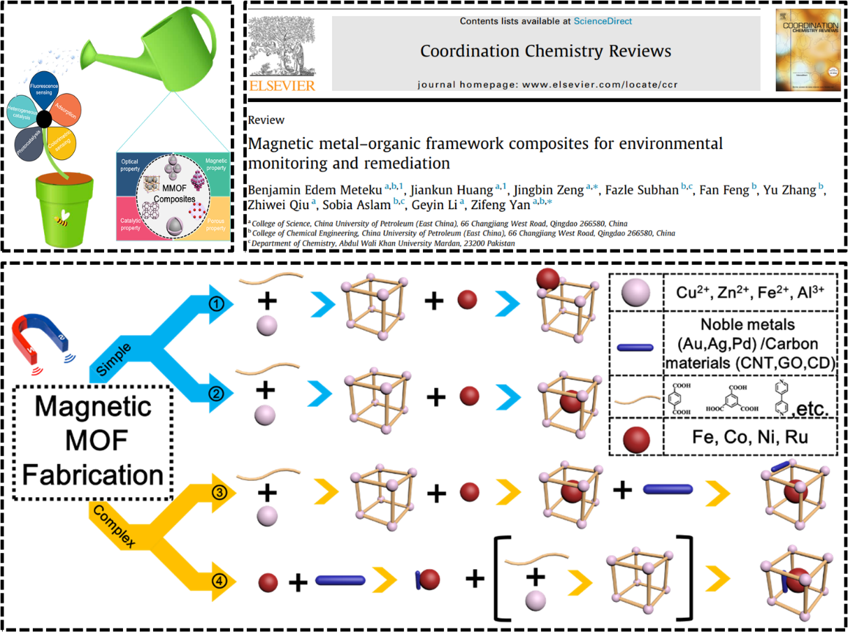 题目为《用于环境监测与修复的磁性金属-有机骨架复合材料》(Magnetic metal-organic framework composites for environmental monitoring and remediation)的综述论文发表在化学领域权威期刊Coordination Chemistry Reviews (DOI information:10.1016/j.ccr.2020.213261)。博士生本杰明(Benjamin Edem Meteku)、黄剑坤为该论文第一作者。曾景斌副教授、阎子峰教授为共同通讯作者。中国石油大学(华东)为第一署名单位,该项工作得到国家重点研发计划政府间国际科技创新合作重点专项和山东省重点研发计划项目资助。