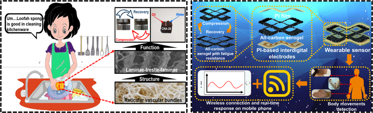 题目为《仿生构筑具有高度有序的层-栈桥-层状结构的铜基海绵》(Biomimetic Fabrication of Highly Ordered Laminae-trestle-laminae Structured Copper Aero-sponge)和《高弹性耐疲劳多拱结构全碳气凝胶基可穿戴传感器》(Multi-arches Structured All-carbon Aerogels with Super Elasticity and High Fatigue Resistance as Wearable Sensors)的研究论文分别发表在材料领域知名期刊ACS Applied Materials & Interfaces(DOI information: 10.1021/acsami.0c01794)和Nanoscale(DOI information: 10.1039/C9NR10593J)。博士生黄剑坤为两篇论文第一作者,曾景斌副教授、阎子峰教授为共同通讯作者。中国石油大学(华东)为第一署名单位。该项工作得到国家重点研发计划专项、山东省重点研发计划以及研究生创新工程项目资助。上述工作通过利用取向性孔道结构赋予三维宏观组装体轻质高强的优势,提供了一种冰晶生长诱导的结构组装技术,以常见的一维金属纳米线、二维还原氧化石墨烯为组装单元,跨尺度构筑具有优异力学性能的三维宏观组装体。这种组装技术可应用于多种取向性微纳结构的创制,为进一步提高宏观组装体的功能化提供了一种可靠方法。