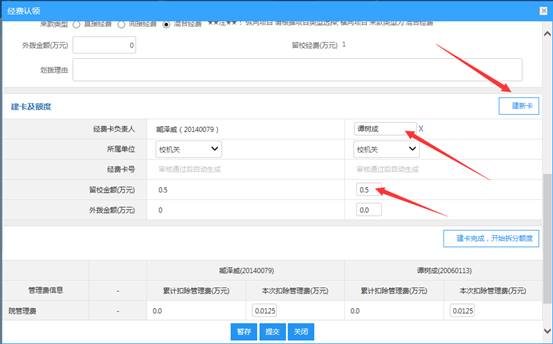 b、若涉及分割,则点击“新建卡”,输入项目组成员,输入分割金额,然后点击“建卡完成,开始拆分额度”,进行新建经费卡的预算编辑(图4,提示:经费卡的预算受项目总预算的控制)。预算编辑完成后点击“提交”完成认领。