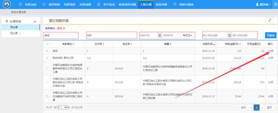 点击平台顶端“入账办理”,输入来款信息进行模糊查询,找到相应的来款记录,点击来款记录最右侧的“认领”进入经费认领页面(若搜不到相应来款,请电询财务处收入管理科,86981607);