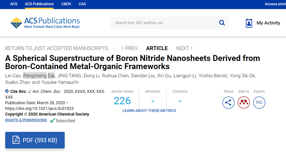 【本站讯】近日,新能源学院赵学波教授领衔的氢能团队在具有工业应用前景的丙烷氧化脱氢制丙烯高性能催化剂研究方面取得新进展,相关论文《含硼金属有机框架化合物衍生的球形超结构氮化硼纳米片》(A Spherical Superstructure of Boron Nitride Nanosheets Derived from Boron-Contained Metal-Organic Frameworks)在国际化学领域顶级期刊Journal of the American Chemical Society发表。yl23455永利2016级博士生曹磊、新能源学院代鹏程副教授为该论文共同第一作者,新能源学院赵学波教授、代鹏程副教授、昆士兰大学Yusuke Yamauchi教授为共同通讯作者,中国石油大学(华东)为第一署名单位。