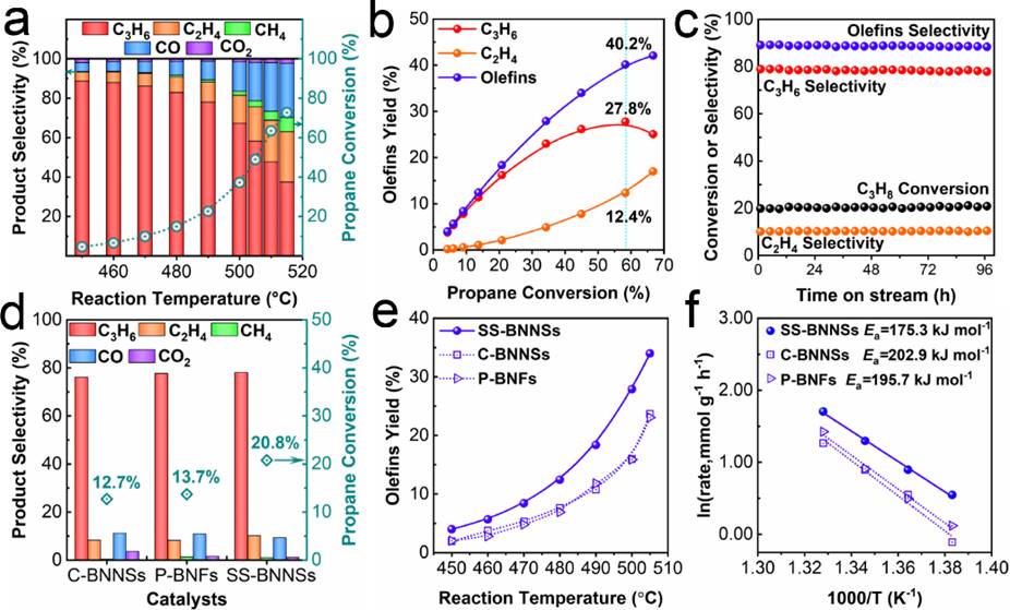 SS-BNNSs在丙烷氧化脱氢反应中表现出了优异的催化性能,510 ºC的操作温度下,产物中烯烃的收率达到了40.2%(丙烯,27.8%;乙烯,12.4%),远超商业化的氮化硼纳米片(丙烯,23.8%;乙烯,8.6%)和高比表面积的氮化硼纤维(丙烯,20.7%;乙烯,10.2%)。通过系统的表征可以发现,SS-BNNSs表面富含B-OH,让催化剂无须活化就可以直接催化反应进行,同时特殊的结构优势提高了活性物种的分散度,利于反应气与活性位点快速接触和产物丙烯的迅速脱附,提升了产物丙烯的单程收率。SS-BNNSs自组装的构造过程和结构优势带来的性能提升拓宽了催化剂的设计思路。