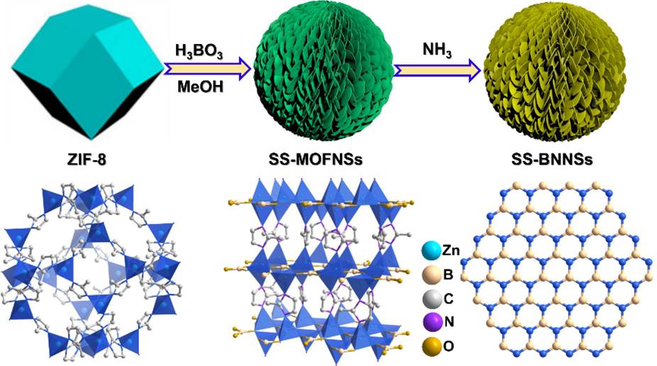 MOFs衍生三维球形超结构氮化硼纳米片示意图