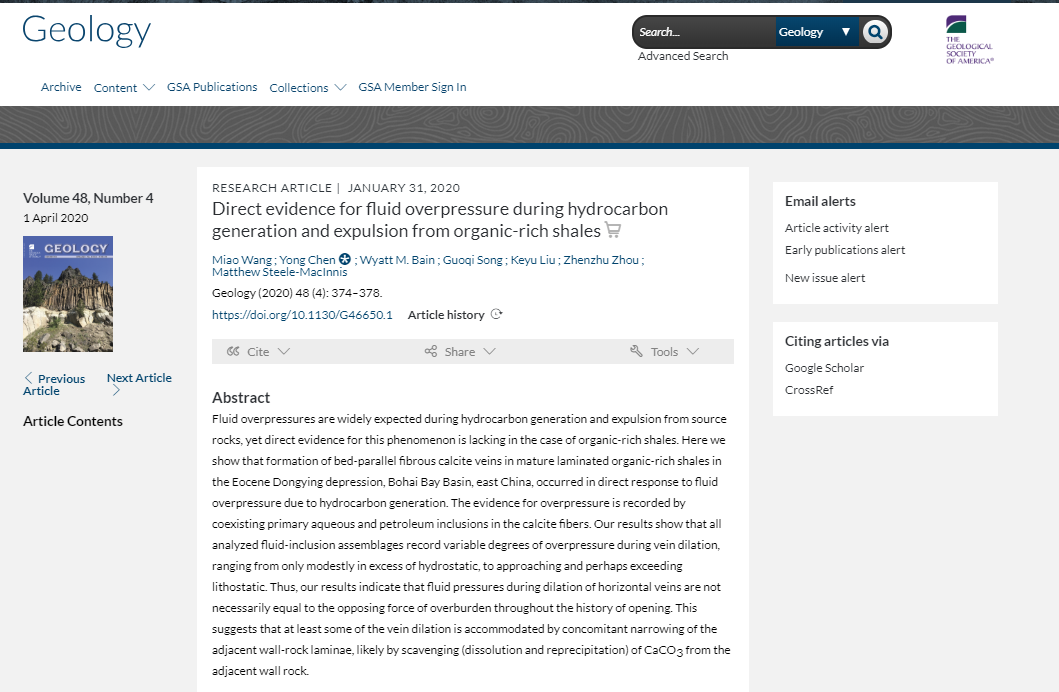 【本站讯】近日,yl23455永利地球科学与技术学院2016级博士研究生王淼、陈勇教授与加拿大阿尔伯塔大学地球和大气科学系Matthew Steele-MacInnis博士团队合作,在烃源岩排烃压力研究方面取得重要进展,相关研究成果《富有机质页岩生排烃流体超压的直接证据》(Direct evidence for fluid overpressure during hydrocarbon generation and expulsion from organic-rich shales)发表在地质学领域顶级期刊Geology上,这是yl23455永利作为第一署名单位首次在该期刊发表论文。