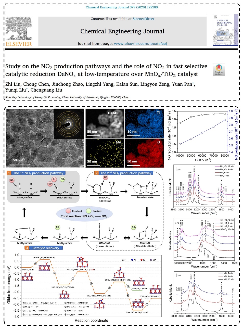 题目为《MnOx/TiO2催化剂上NO2生成路径及NO2在低温下快速SCR脱硝反应中的作用机理研究》(Study on the NO2production pathways and the role of NO2in fast selective catalytic reduction DeNOxat low-temperature over MnOx/TiO2catalyst)的研究论文发表在化工领域权威期刊Chemical Engineering Journal上(Chemical Engineering Journal2020, 379, 122288)。研究人员发现低温NH3-SCR反应(NH3+NO+O2→N2+H2O)是NO氧化反应(NO+O2→NO2)与“快速SCR”反应(NH3+NO+NO2→N2+H2O)耦合的结果,NO氧化反应是整个低温NH3-SCR过程的控速反应。结合原位红外和密度泛函理论计算等手段,发现了一种新型二齿硝酸盐中间产物(*MnO2NO2),并提出了完整的NO催化氧化路径。该工作为后续高效低温NH3-SCR催化剂的设计合成提供了重要思路及理论基础。