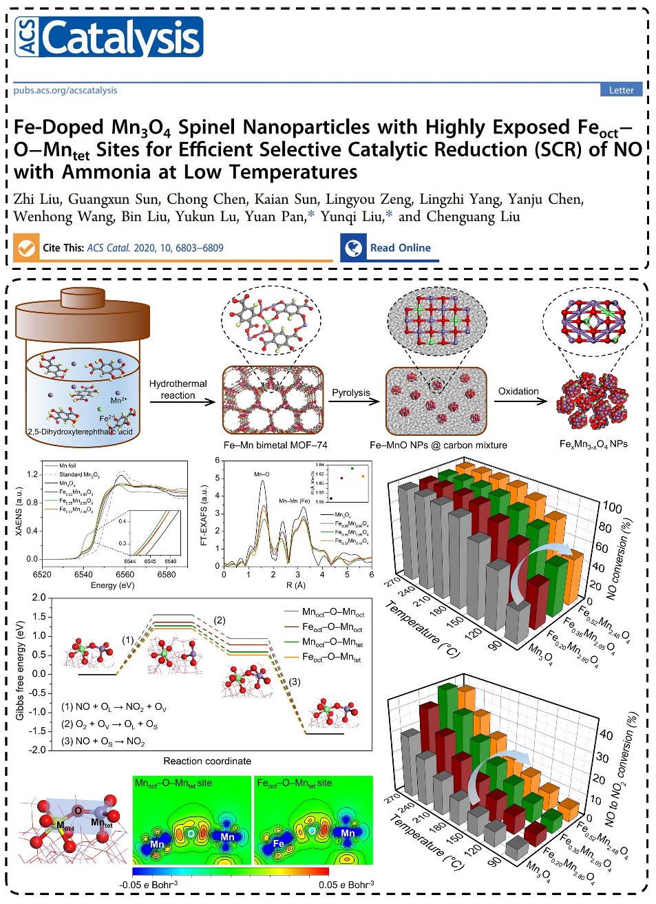 题目为《Feoct−O−Mntet位点高度暴露的Fe掺杂Mn3O4尖晶石纳米颗粒催化剂低温下高效选择性催化还原氮氧化物》(Fe-doped Mn3O4spinel nanoparticles with highly exposed Feoct−O−Mntetsites for efficient selective catalytic reduction (SCR) of NO with ammonia at low temperatures)的研究论文发表在催化领域权威期刊ACS Catalysis上(ACS Catalysis, 2020, 10, 6803–6809)。基于前文对低温NH3-SCR反应机理的研究,NO氧化反应是低温NH3-SCR过程的关键,而氧缺位在金属氧化物表面氧化反应中起到关键作用。鉴于此,本工作旨在采用变价金属Fe对Mn3O4尖晶石结构精准、均匀掺杂,进而调控材料Mn-O键强度及缺位生成能。传统制备方法(如:浸渍法、共沉淀法)无法实现Fe–Mn复合氧化物材料的精准控制合成,难以对催化点位和催化活性进行构效关联,进而导致对本征活性位点认识不足。本工作以Fe–Mn双金属有机框架化合物为前驱物,精准合成了系列Fe/Mn摩尔比可调的、小尺寸的、组分和形貌均一的Fe–Mn尖晶石催化剂(FexMn3-xO4NPs)。Fe0.35Mn2.65O4NPs催化剂能在180℃、400000 h-1下达到90% NO脱除率。基于对材料的精准控制合成以及同步辐射X射线吸收光谱对材料的结构精细解析,建立了Fe–Mn尖晶石材料表面活性位点与NH3-SCR活性之间的构效关系,揭示了具有高本征活性的Feoct–O–Mntet活性位点。同时,结合理论研究发现催化剂表面氧缺位的生成是NO氧化反应的控速基元反应。Feoct–O–Mntet位点具有最低的氧缺位生成能,这是其高本征活性的根本原因。该工作对低温NH3-SCR活性点位有了新的认识,并对高效低温NH3-SCR催化剂的设计合成具有重要指导意义。