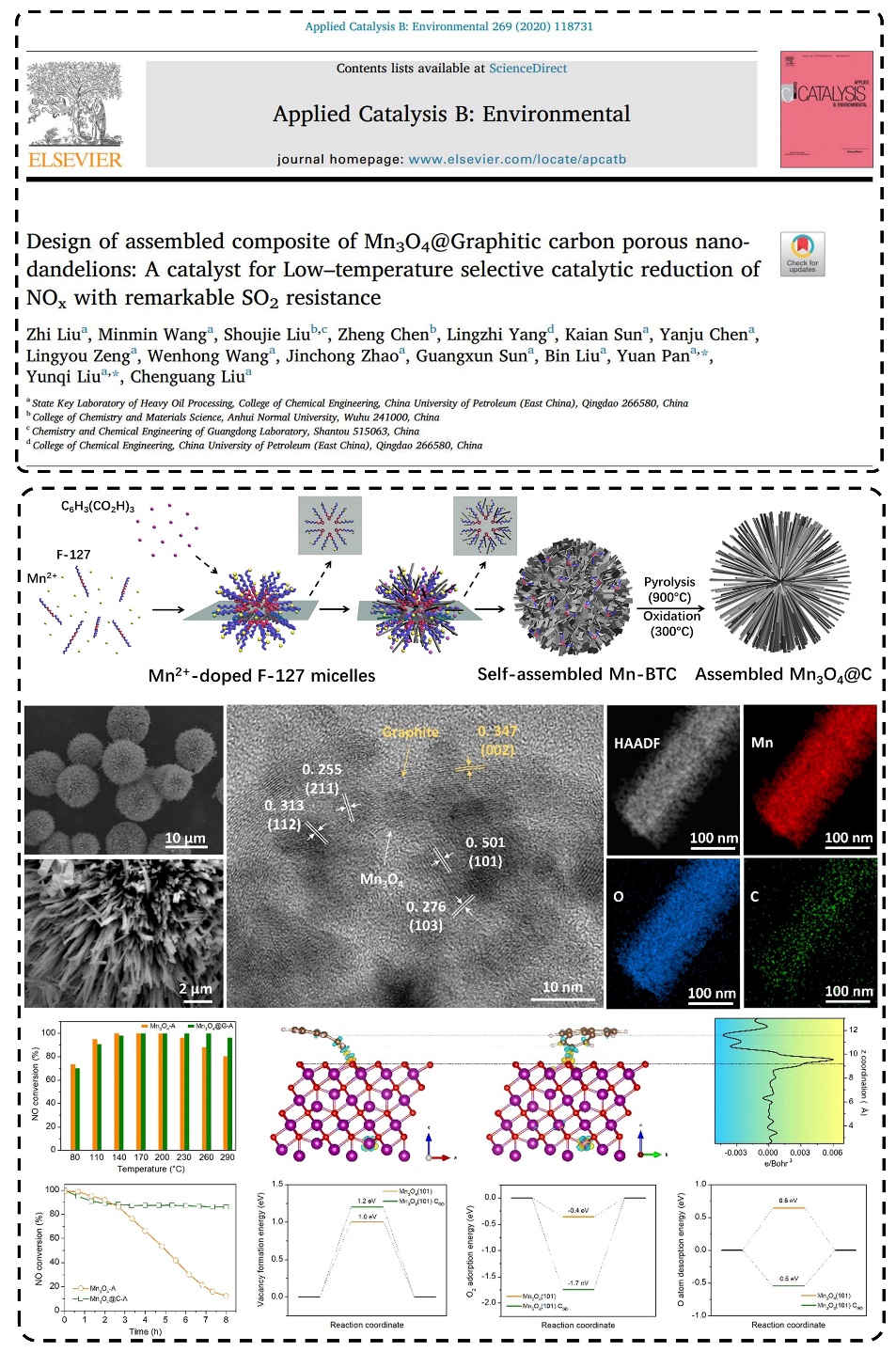 题目为《设计合成自组装多孔Mn3O4@石墨碳纳米蒲公英催化剂:一种具有显著抗SO2中毒性能的低温NH3-SCR催化剂》(Design of assembled composite of Mn3O4@Graphitic carbon porous nanodandelions: A catalyst for Low–temperature selective catalytic reduction of NOxwith remarkable SO2resistance)的研究论文发表在催化领域权威期刊Applied Catalysis B: Environmental上(Applied Catalysis B: Environmental, 2020, 269, 118731)。抗SO2中毒性能是抑制锰基催化剂工业化应用的瓶颈。在对锰基催化反应机理充分认识的基础下,该工作以锰基金属有机框架化合物为前驱物,通过“限域-热解-氧化”策略,设计合成了新型石墨碳改性的Mn3O4纳米颗粒催化剂。该催化剂表现出较高的脱硝活性(在160℃、100 000 h-1下能达到90%以上NO转化率)及显著提高的抗SO2中毒性能。结合同步辐射X射线吸收光谱及理论计算,揭示了石墨碳在提高催化剂抗SO2中毒性能中的积极作用:电子可以由石墨碳向Mn3O4纳米颗粒转移,进而精准调节Mn3O4的电荷性质及氧化性,Mn3O4纳米颗粒适宜的氧化性能够避免SO2氧化为SO3,进而抑制NH4HSO4生成、提高催化剂抗SO2中毒性能。该工作为设计合成具有高效抗SO2中毒性能的低温NH3-SCR催化剂提供了新的思路。