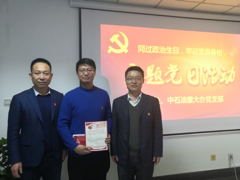 12月25日,科技处、中油办党支部组织开展“同过政治生日,牢记党员身份”主题党日活动。本次活动由支部书记董成立主持,机关党委副书记柴延松应邀出席。通过会前支部书记与各位委员谈话,集体观看宣传教育视频,颁发政治生日贺卡,赠送理论学习书籍,重温入党誓词等活动,加强党性教育,提升党性修养。