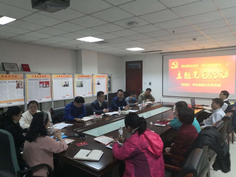 12月25日,科技处、中油办党支部组织开展“同过政治生日,牢记党员身份”主题党日活动。本次活动由支部书记董成立主持,机关党委副书记柴延松应邀出席。通过会前支部书记与各位委员谈话,集体观看宣传教育视频,颁发政治生日贺卡,赠送理论学习书籍,重温入党誓词等活动,加强党性教育,提升党性修养。